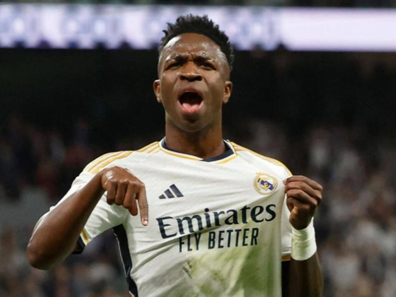 Vinícius Júnior celebra o gol que encerrou seu jejum, expressando alívio e gratidão no campo.